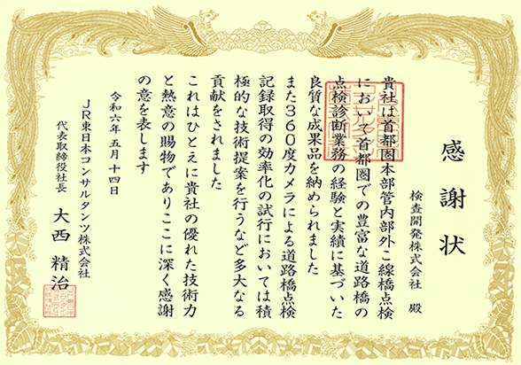 5月14日、JR東日本コンサルタンツ株式会社殿より「豊富な道路橋の点検診断業務の経験と実績に基づいた良質な成果」と「360度カメラによる道路橋点検記録取得の効率化への貢献」について、感謝状を頂きました。
