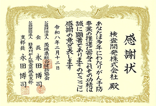 2月12日、茨城県が主催する令和7年度「県民健康づくり表彰」において、長年にわたり積極的ながん検診の推進に取り組み、社員の受診率向上に寄与した功績が認められ、茨城県総合健診協会殿および日本対がん協会茨城県支部殿より感謝状を頂きました。